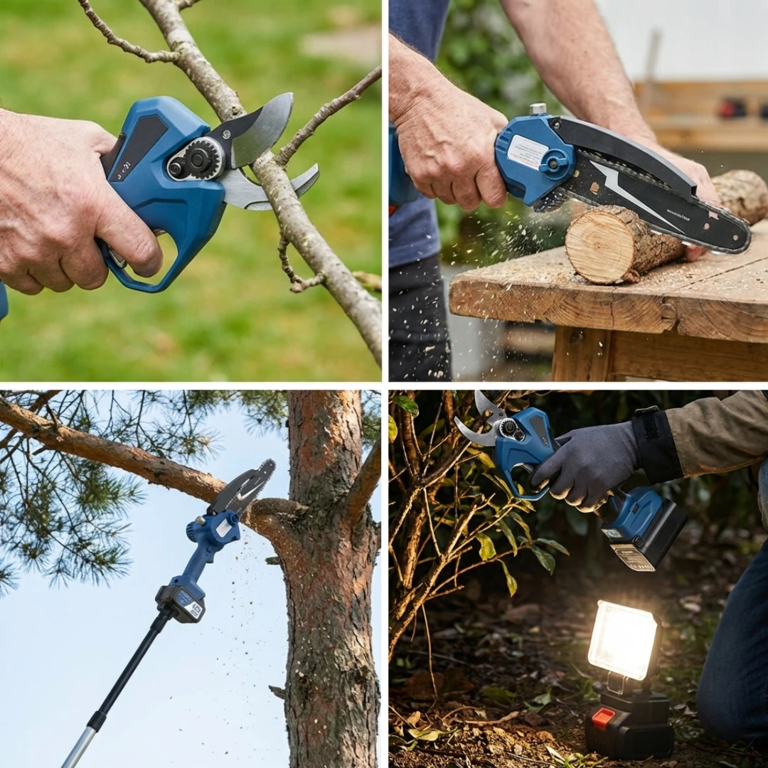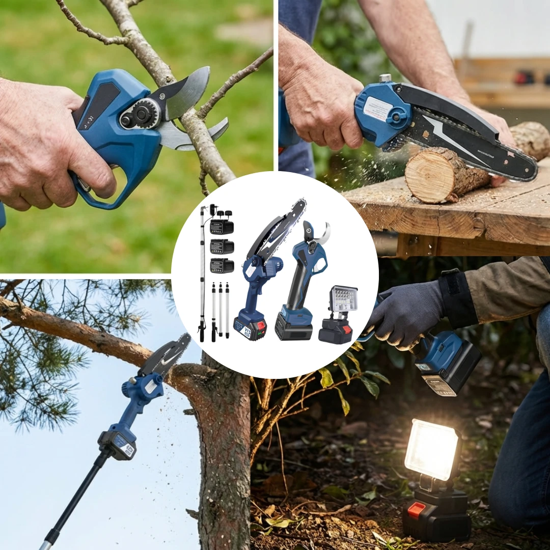 Motosega, cesoia, asta, luce LED e kit di protezione. Zero pensieri: un solo acquisto e il tuo giardino inizia a prendere forma.