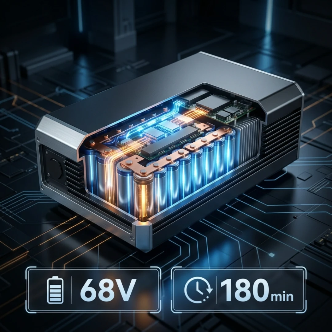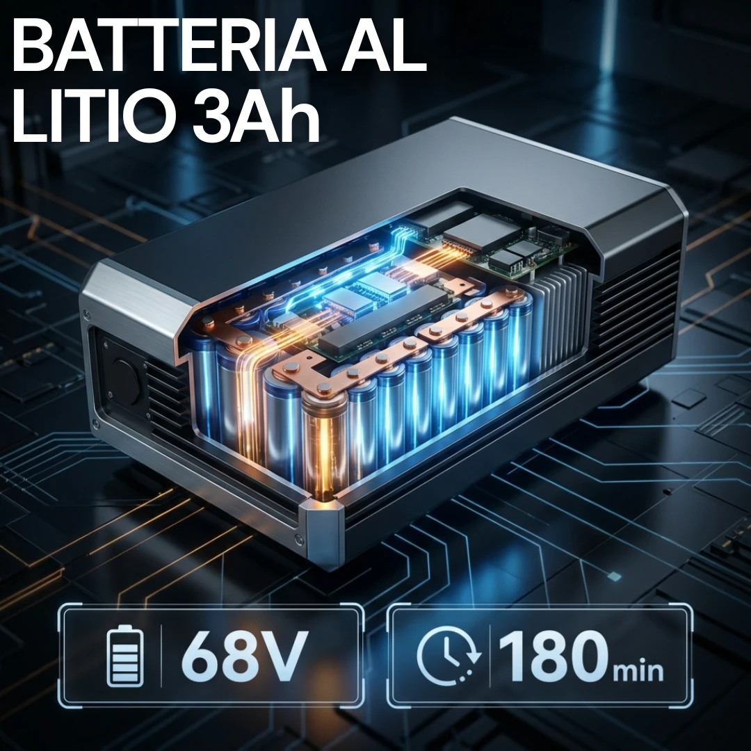 3 batterie 68V 3.000 mAh + mini base di ricarica