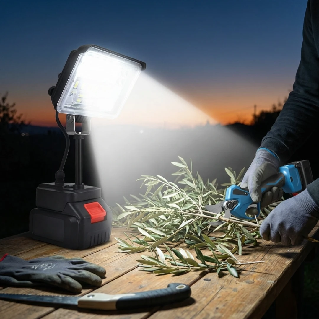 La poggi, la punti e illumina tutta la zona di lavoro. Le mani restano libere, la luce resta dove serve. La batteria a lunga durata permette un funzionamento costante per giorni.