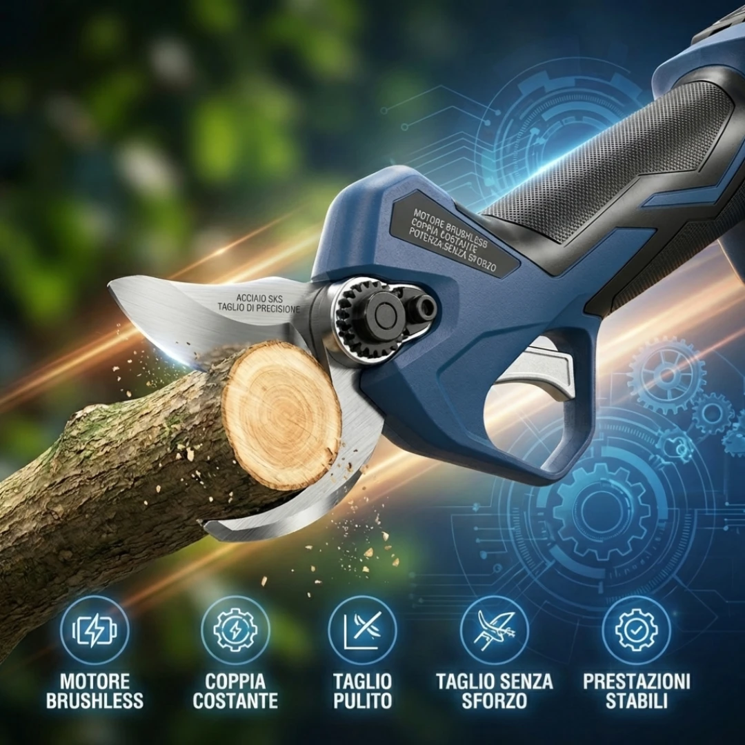Il ramo grosso dell'ulivo? Lo attraversa come burro. Non ci credevo finché non l'ho provato. La mini base di ricarica è comoda, ci metti le batterie e le trovi pronte la mattina dopo.