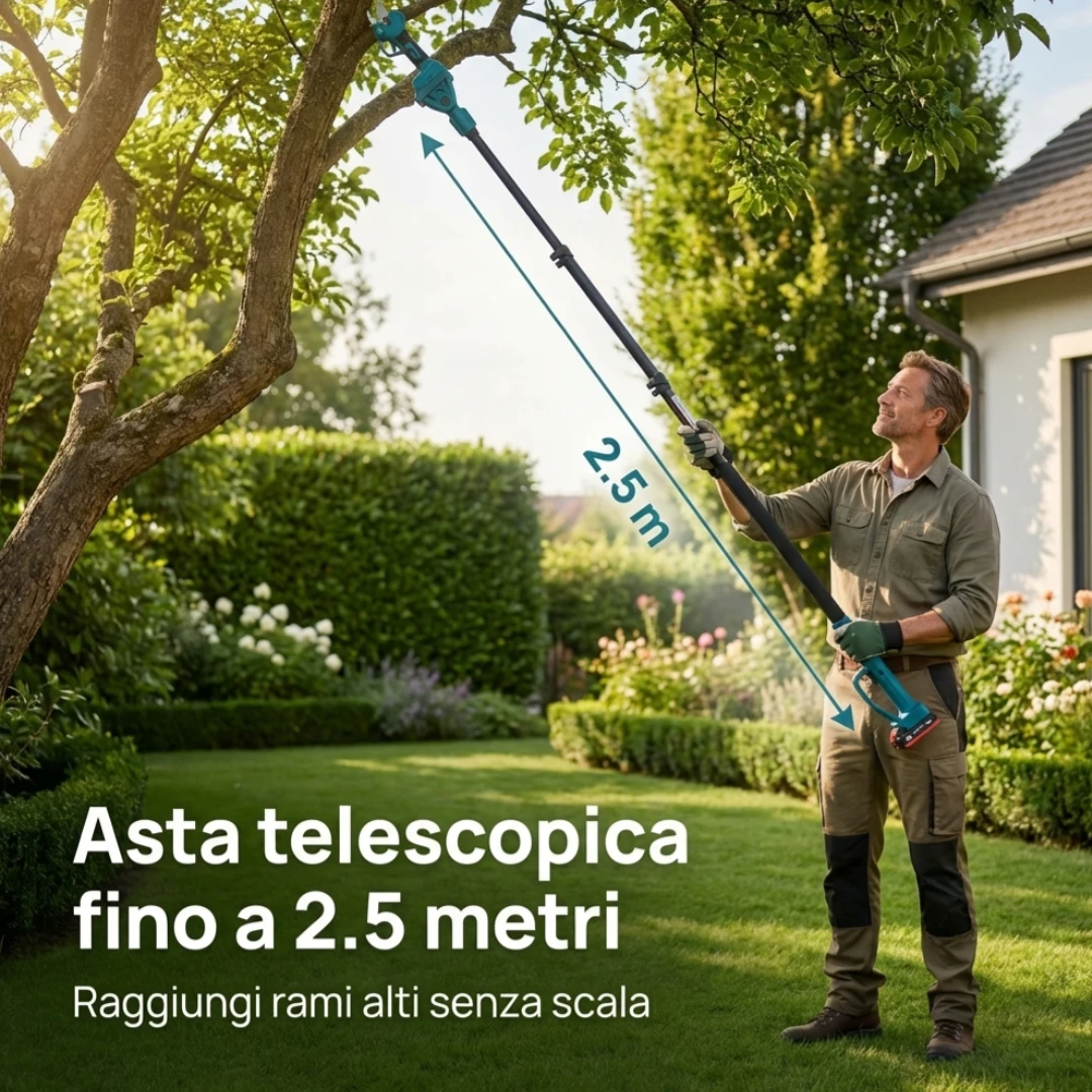 Asta telescopica fenomenale. Ho potato il noce alto 6 metri senza salire sulla scala. La luce LED è comodissima: la punti sulla zona di lavoro e hai le mani libere. Consigliatissimo.