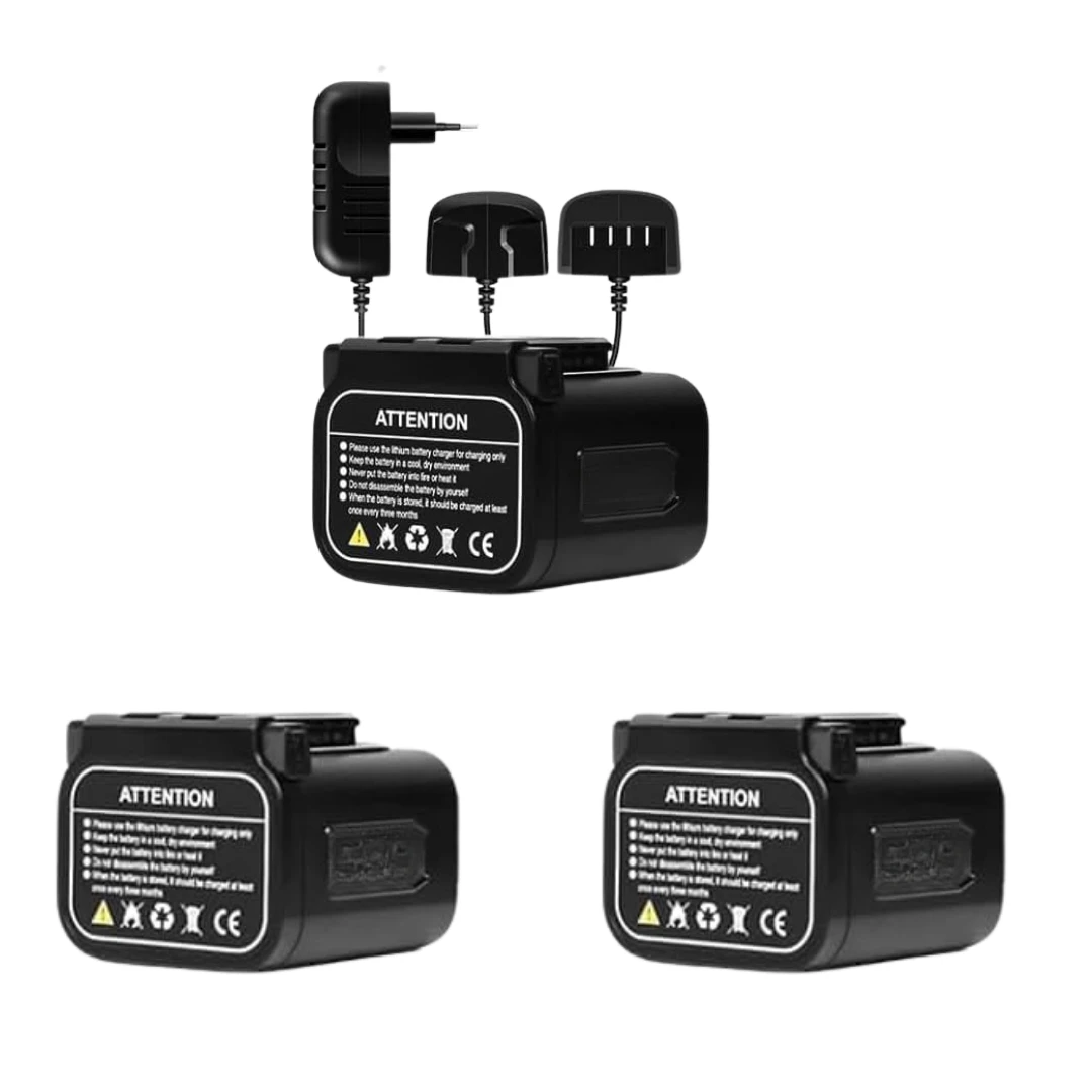 Tre batterie al litio da 3.000 mAh, una per strumento, fino a 180 minuti di autonomia. Si ricaricano sulla mini base inclusa e sei sempre operativo.